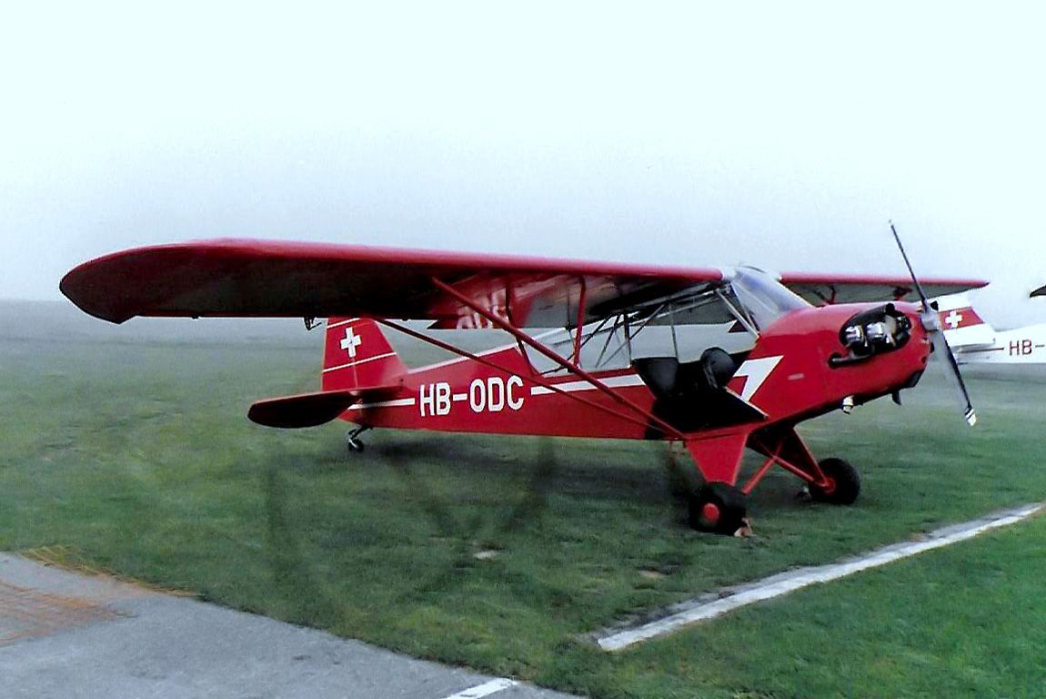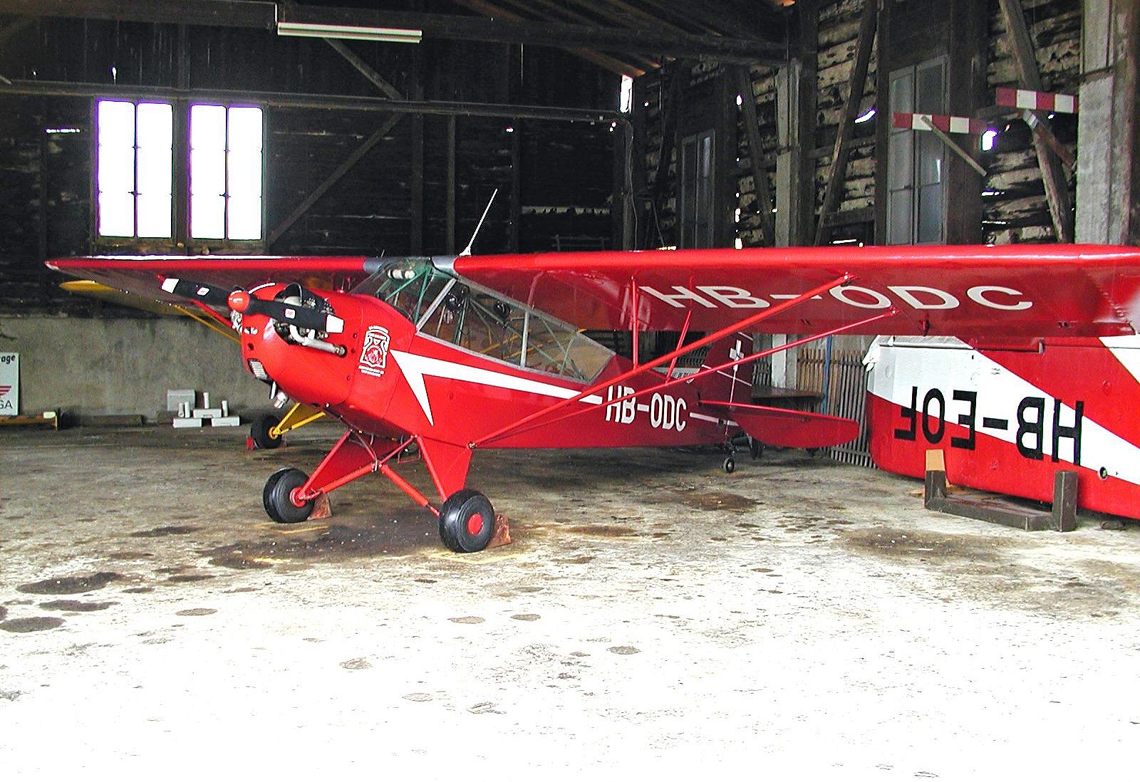 Le HB-ODC se trouve dans l’ancien hangar en bois (qui n’existe malheureusement plus), avec une publicité sur le côté gauche du fuselage du sponsor de l’époque pendant 5 ans : la brasserie des sauges.